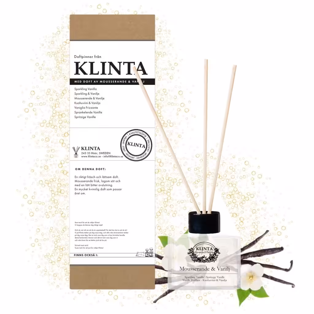 Klintas Doftpinnar har samma milda och rena doftegenskaper som Massageljusen och vi väljer att gå samma väg vi hittills gjort, nämligen den naturliga och den miljövänliga. Till skillnad från många andra doftpinnar som mestadels består av alkohol eller glykol har Klinta grävt lite djupare och hittat en vegetabilisk olja med lika goda doftbärande egenskaper som alkohol men utan den starkt alkoholhaltiga ångan. Klintas Doftpinnar baseras nämligen på olja från sojabönan en lättodlad och snabbväxande böna som är helt förnyelsebar. Sedan tillsätts det antingen eterisk olja eller doftolja.