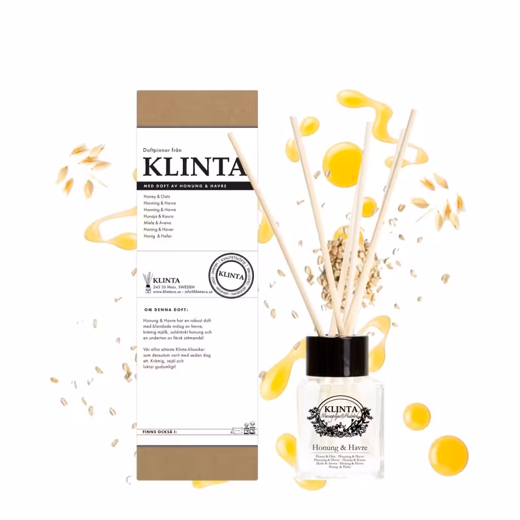 Doftbeskrivning: Honung & Havre har en robust doft med blandade inslag av havre, krämig mjölk, soldränkt honung och en underton av färsk sötmandel. Vår allra sötaste Klinta-klassiker som dessutom varit med sedan dag ett. Krämig, rejäl och luktar gudomligt!