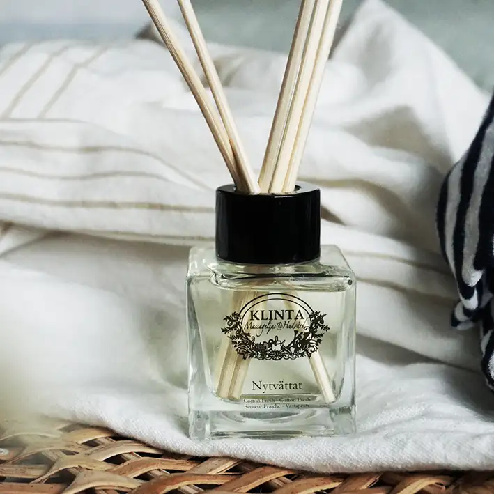 Klintas Doftpinnar har samma milda och rena doftegenskaper som Massageljusen och vi väljer att gå samma väg vi hittills gjort, nämligen den naturliga och den miljövänliga. Till skillnad från många andra doftpinnar som mestadels består av alkohol eller glykol har Klinta grävt lite djupare och hittat en vegetabilisk olja med lika goda doftbärande egenskaper som alkohol men utan den starkt alkoholhaltiga ångan. Klintas Doftpinnar baseras nämligen på olja från sojabönan en lättodlad och snabbväxande böna som är helt förnyelsebar. Sedan tillsätts det antingen eterisk olja eller doftolja.