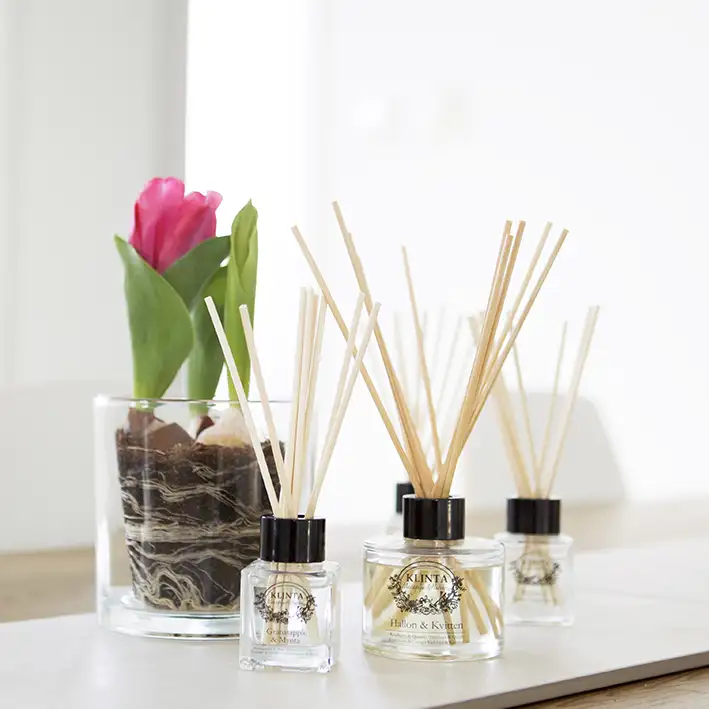 How to use reed diffusers: Reed diffusers are easy to use and a great complement to Klinta’s Massage Candles. Place the sticks upright in the oil. If you want less scent, use fewer sticks. If you want more scent, turn the sticks upside down from time to time. Then leave without any further maintenance.