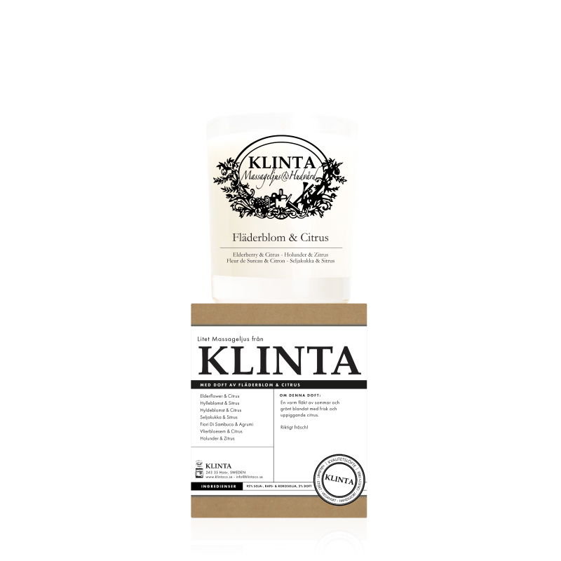 Klinta Massageljus är helt vegetabiliska och giftfria ljus med den extra bonusen att de är massageljus som kan användas på hela kroppen. Den vegetabiliska basen har blandats med aromoljor av högsta kvalitet och tappats i återvunnet glas. Alla Klintas produkter genomgår en hög kvalitetskontroll för att säkerställa rättvisa och älskade produkter.