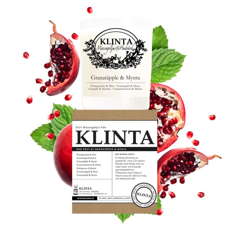 Klinta Massageljus är helt vegetabiliska och giftfria ljus med den extra bonusen att de är massageljus som kan användas på hela kroppen. Den vegetabiliska basen har blandats med aromoljor av högsta kvalitet och tappats i återvunnet glas. Alla Klintas produkter genomgår en hög kvalitetskontroll för att säkerställa rättvisa och älskade produkter.