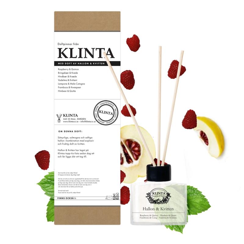 Doftbeskrivning: Sötsyrliga, solmogna och saftiga hallon i kombination med explosiv och fruktig doft av kvitten. Hallon & Kvitten har legat på Klintas topp-tre-lista sedan dag ett och lär ligga där ett tag till.