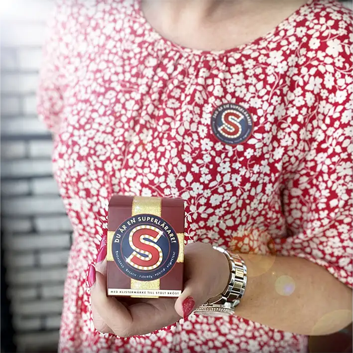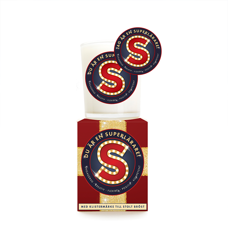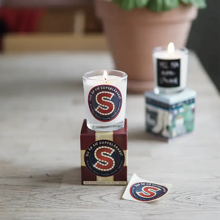 Ett stort tack och fina komplimanger till läraren! Ljuset passar både sommar- och vinteravslutningen och förutom budskapet på själva lådan och ljuset så får favoritläraren minsann också en etikett att stolt sätta på kavajslaget eller bröstet för att visa heeela världen just hur poppis hen är!