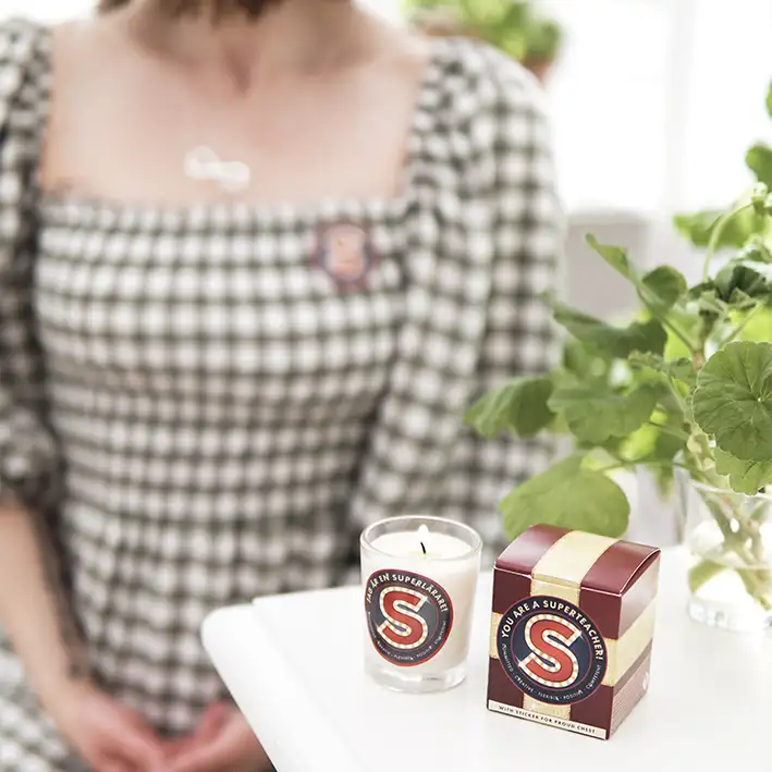 Bara någonting litet-ljusen innehåller exakt samma ingredienser som alla Klintas ljus - sojavax, rapsolja, kokosolja och doftolja/eterisk olja avsedd för hudvård. Just Superlärar-ljuset har doften Mousserande & Vanilj.