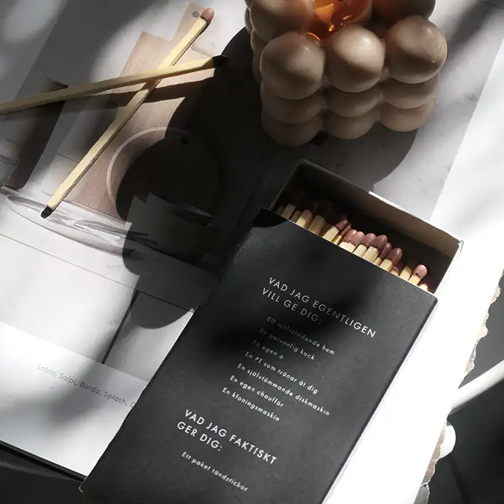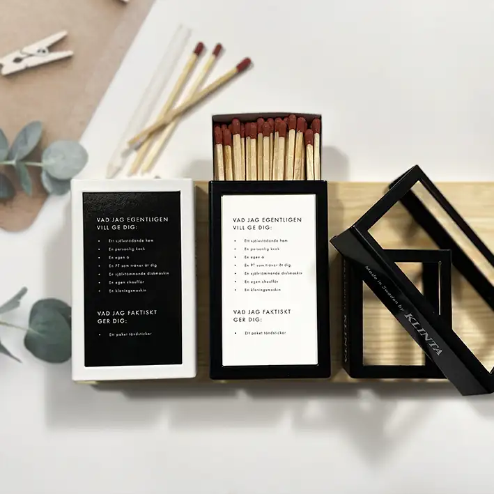 Klintas tändsticksaskar lockar till beundran, skratt och glädje! Men inte bara det - både själva stickan och asken tillverkas av FSC-märkt trä och är 100% biologiskt nedbrytbara. De naturfärgade tändhattarna är fria från tungmetaller, svavel, kaliumklorat och zinkoxid och är giftfria och ofarliga för miljön. Och hela produkten tillverkas i EU. Bra va!