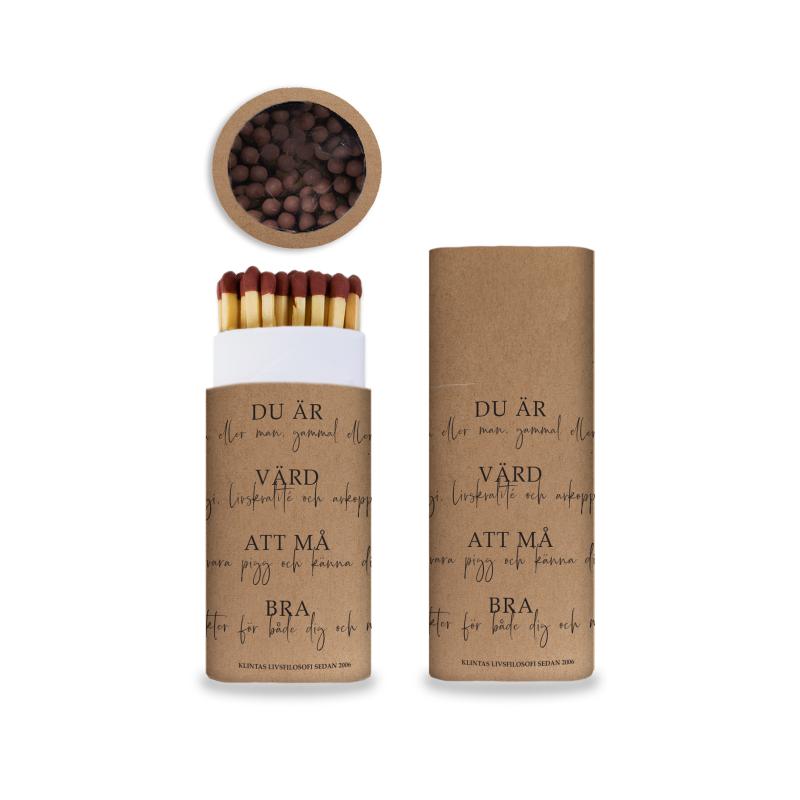 Klintas tändsticksaskar lockar till beundran, skratt och glädje! Men inte bara det - både själva stickan och asken tillverkas av FSC-märkt trä och är 100% biologiskt nedbrytbara. De naturfärgade tändhattarna är fria från tungmetaller, svavel, kaliumklorat och zinkoxid och är giftfria och ofarliga för miljön. Och hela produkten tillverkas i EU. Bra va!